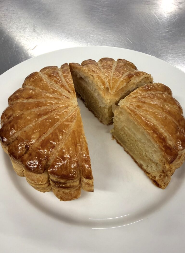 Note: it is tradition to bake a fève (bean) into the tart and whoever gets the bean gets to be the roi (king) for the day. Simply place the bean into the frangipane before adding the top circle of pastry.