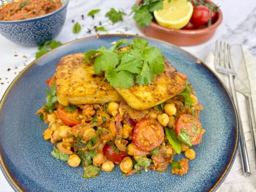 Marinated Tofu with Chickpea, Tomato & Fresh Herb Salad with Red Pesto