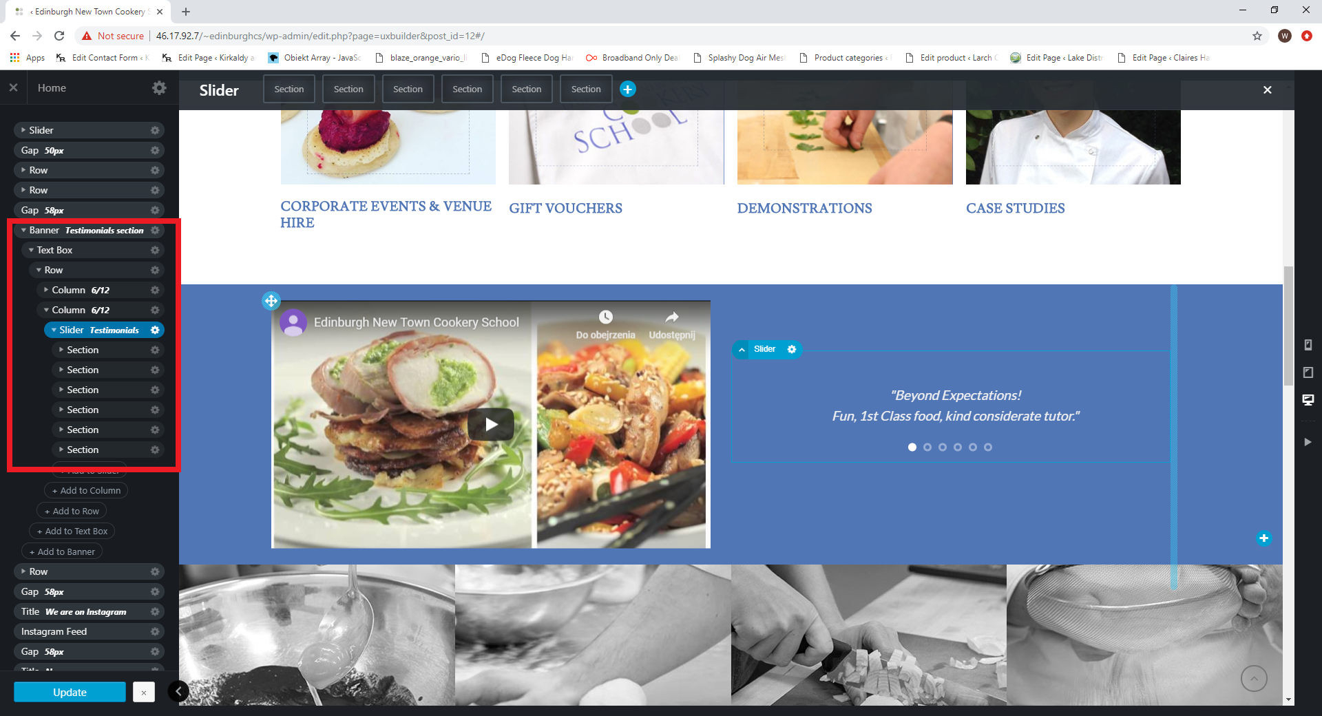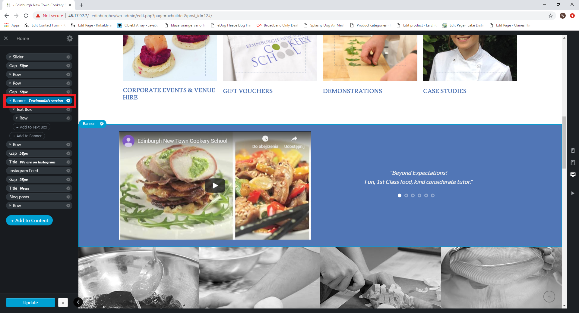 Open Homepage with UX builder, find a Banner with “testimonials section” label.