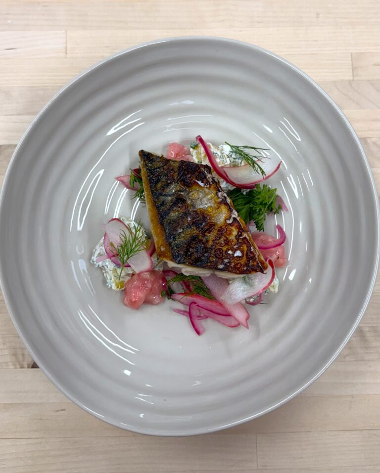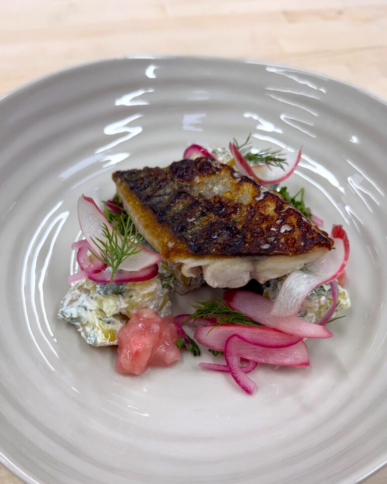 - Arrange the potato salad, compote and pickles on your plate, place the mackerel fillet on top and garnish with sprigs of dill and parsley.