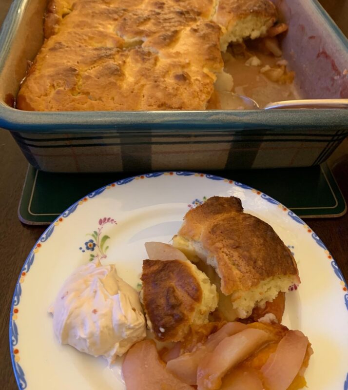 This is a wonderful pudding to make as the year moves into the season of Orchard Fruits. You can choose what fruits to put in here, apples, pears, plums, greengages and damsons but you can also add peaches, nectarines and apricots. The batter is put onto the top of the fruit in spoonfuls so that the finished dish resembles a cobbled road.